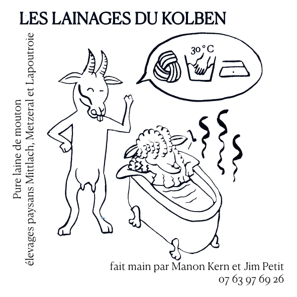 L'ensemble de nos lainages sont fabriquées à partir de laine de mouton que nous transformons à la main (nettoyage, cardage, filage au rouet, feutrage et tissage). Les laines proviennent d'élevages paysans en montagne vosgienne (élevage des artistes et d'ami·e·s paysan·ne·s dans un rayon de 30 kms de l'atelier). Chaque modèle est unique.